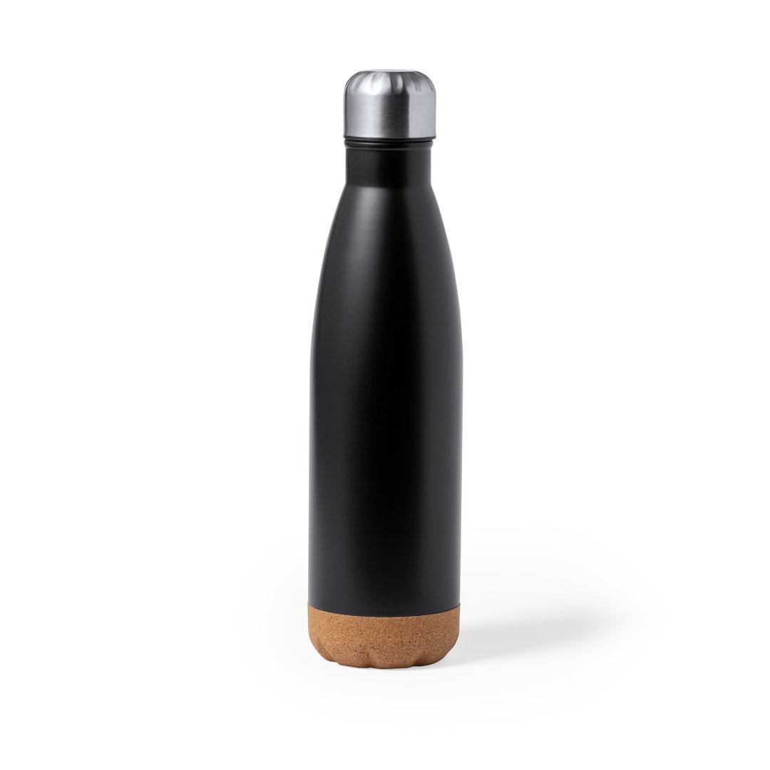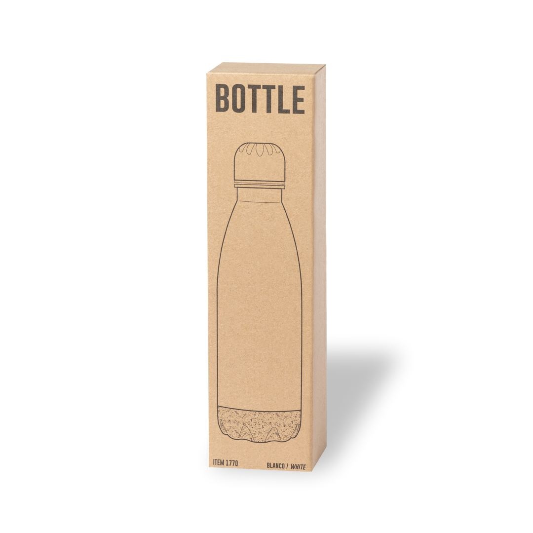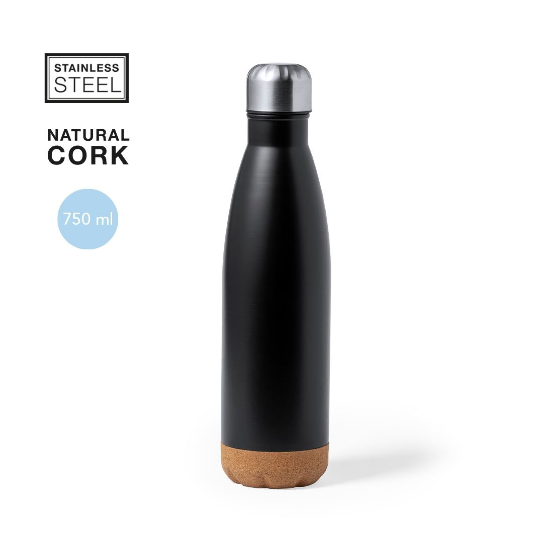 Bouteille d'une capacité de 750 ml, fabriquée en acier inoxydable. Avec une base en liège naturel et un bouchon à vis, sans BPA. Disponible dans une large gamme de couleurs satinées et présenté dans une boîte individuelle en kraft design.Manuel d'instructions disponible en espagnol et en anglais.