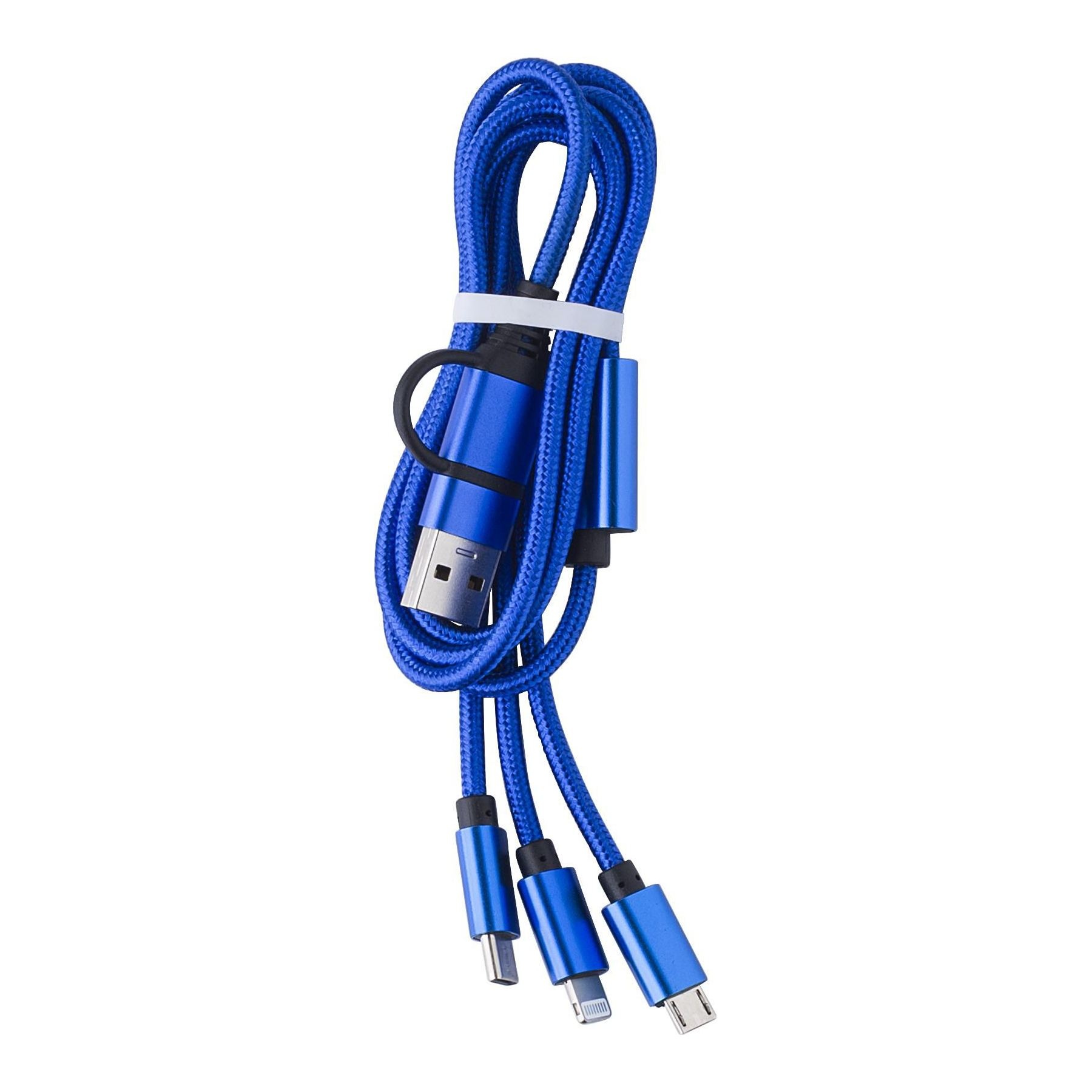 Câble de charge en cuivre avec entrée USB et USB-C 1,5A et sortie micro USB, USB-C et Lightning. dans une boîte cadeau en kraft.