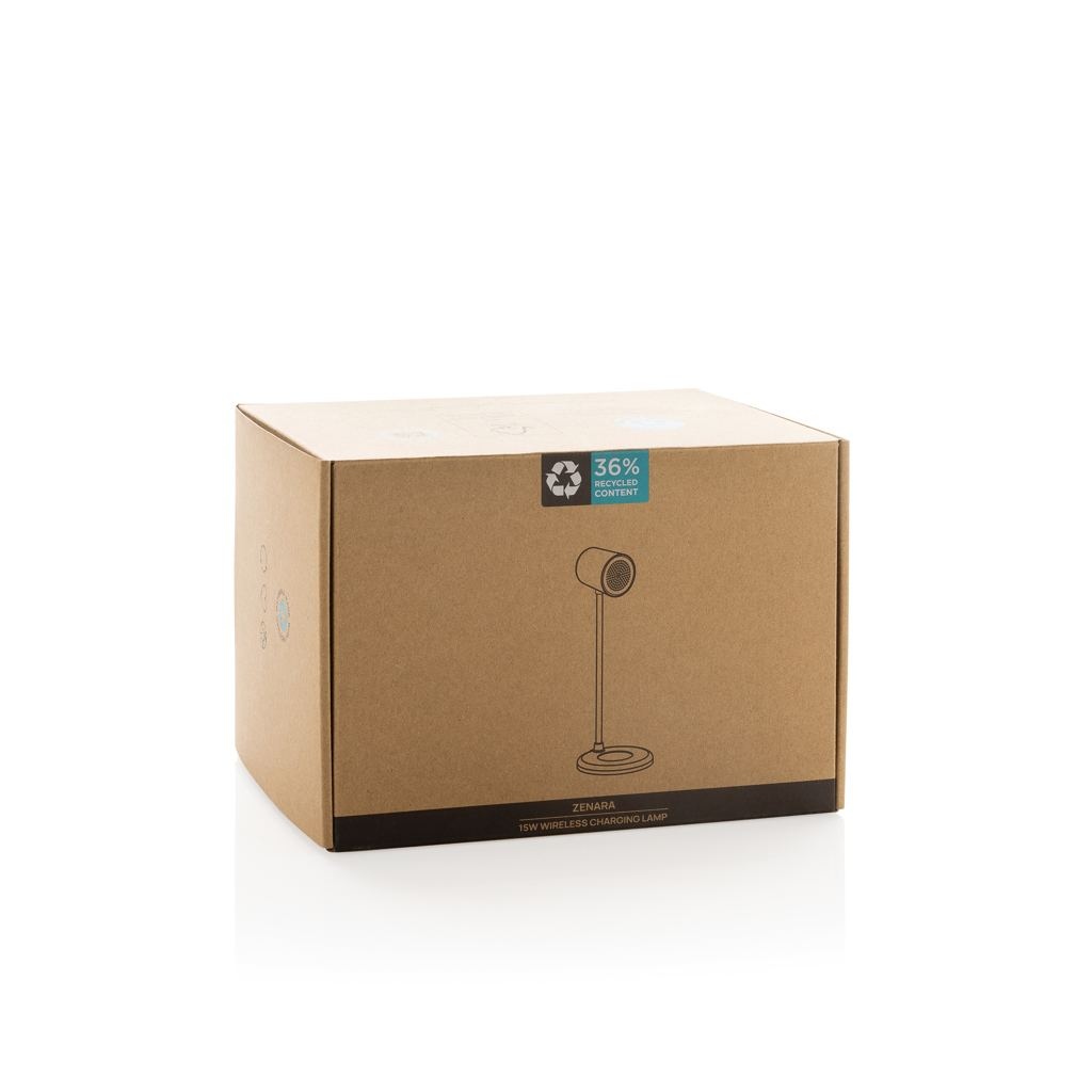 Chargeur sans fil 15W ultra-rapide avec lampe de bureau intégrée. La lampe de bureau flexible fournit 55 lumens et dispose de 3 modes d'éclairage (chaud, blanc et hybride). Fabriquée avec de l'ABS recyclé RCS, du PC recyclé et du liège FSC. Chargement sans fil compatible avec les dernières générations d'Android, iPhone 8 et plus. L'article et les accessoires sont exempts de PVC. Câble de recharge de type C de 120 cm inclus, fabriqué à partir de TPE recyclé certifié RCS. Emballé dans une boîte kraft FSC® mix. Type-C in ; Input 5V/2A ; 9V/2A;12V/1.5A ; Wireless output 5V/1A;9V/1.1A ; 9V/1.67A (15W) Total recycled content : 36 % sur la base du poids total de l'article. La certification RCS garantit une chaîne d'approvisionnement entièrement certifiée pour les matériaux recyclés.