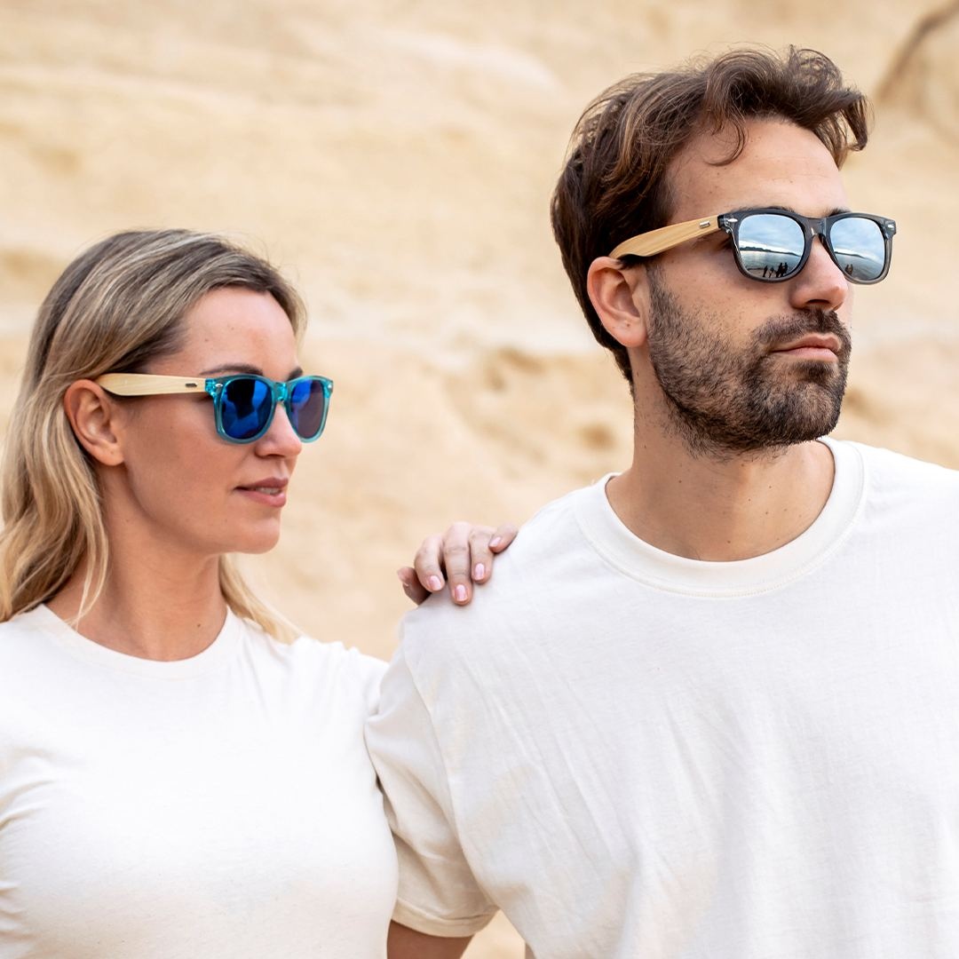 Lunettes de soleil en bambou avec protection UV400. Monture colorée assortie aux cristaux en matériau PC résistant et broches en bambou. Verres AC (acétate de cellulose) finition miroir de couleur, disponibles dans une gamme variée de couleurs en combinaison avec la monture. Présenté dans un sac unique design eco.Des matériaux tels que le bambou encouragent l’utilisation de matières premières naturelles en réduisant les émissions polluantes. Il provient d’une plante très résistante et polyvalente, avec une croissance et une régénération rapides, étant une excellente alternative à l’utilisation du bois traditionnel.