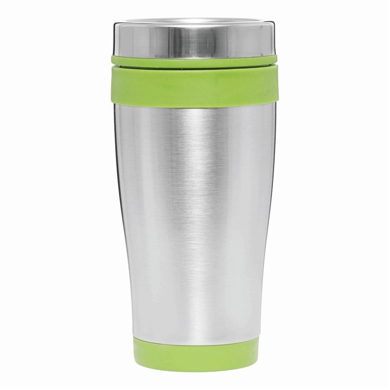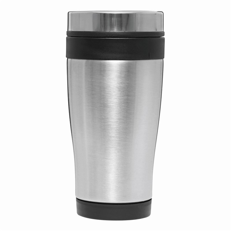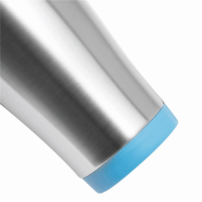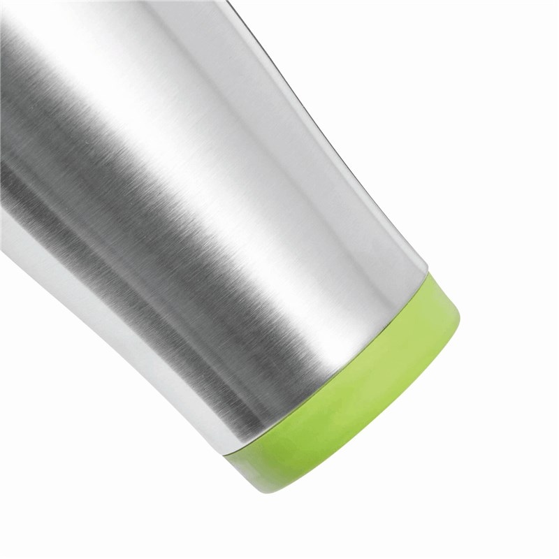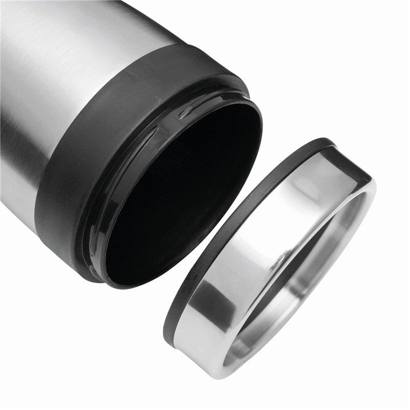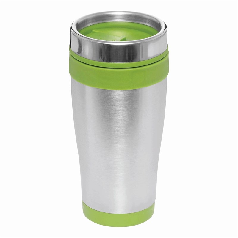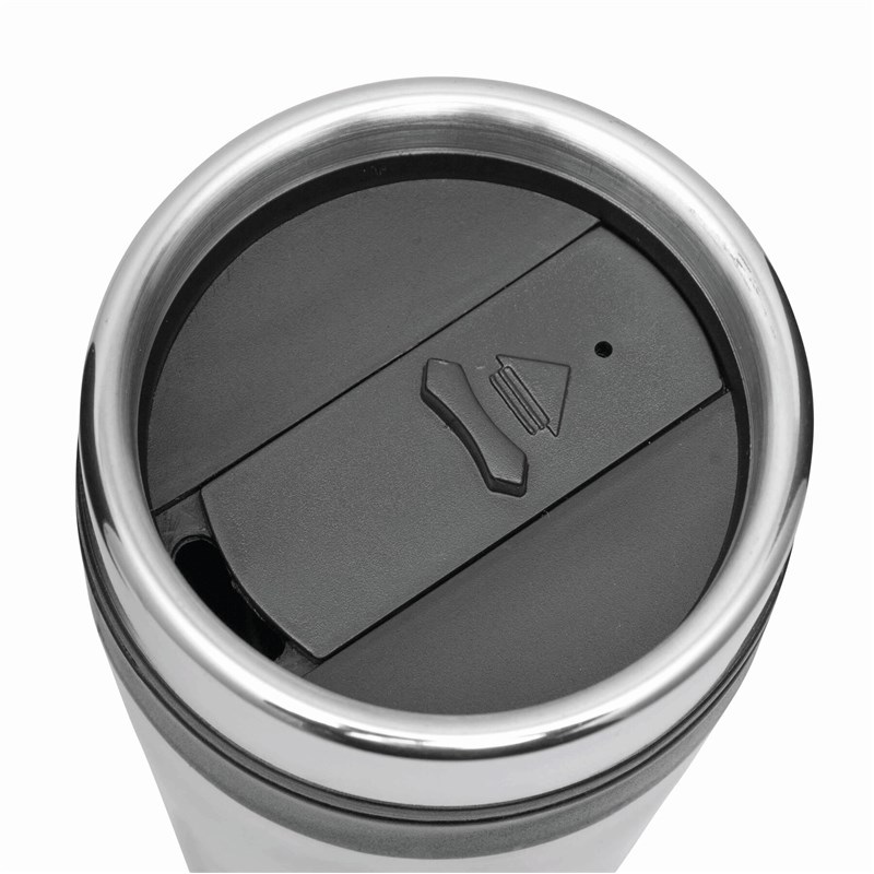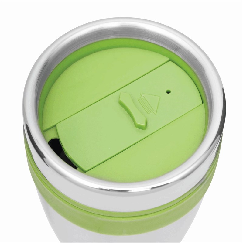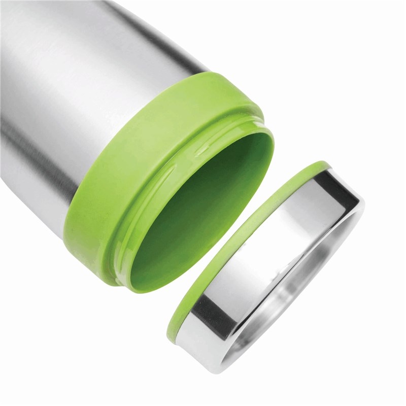 Mug isotherme LUNGO, double paroi: extérieur inox, intérieur plastique, couvercle à visser, avec ouverture intégrée, avec des accents plastiques colorés, contenu env. 400 ml