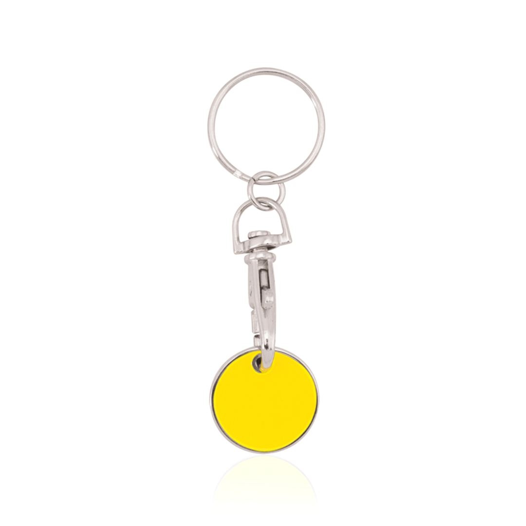 Porte-clés monnaie métallique aux couleurs variées. Monnaie amovible et fermeture par mousqueton