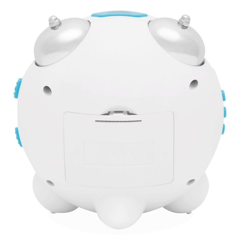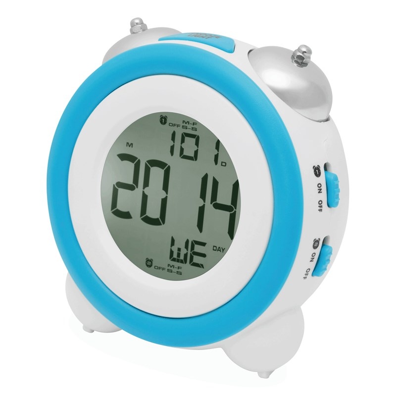 Réveil MODERN RETRO avec affichage digital pour l´heure et la date. Possibilité de mettre deux réveils ainsi que des intervalles de répétition d´alarme selon les jours de la semaines, fonction Snooze (rythme de 5 minutes), alarme avec rappel de sonnerie, éclairage de fond bleu, touches bleues sur les côtés.