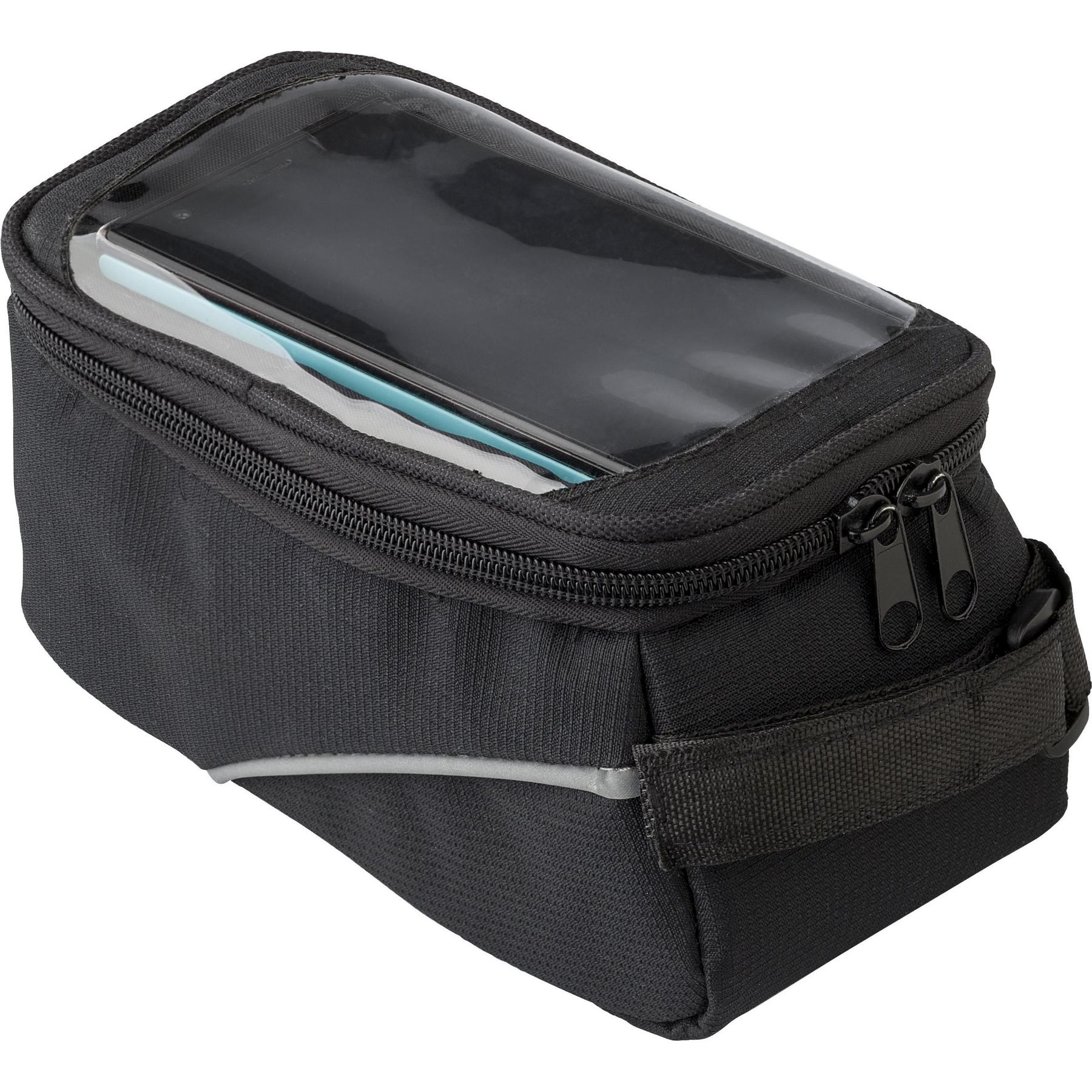 Sacoche pour vélo en polyester 600D adaptable au guidon d'un vélo avec compartiment en PVC pour smartphone, dont les fonctions restent opérationnelles, et sortie audio.