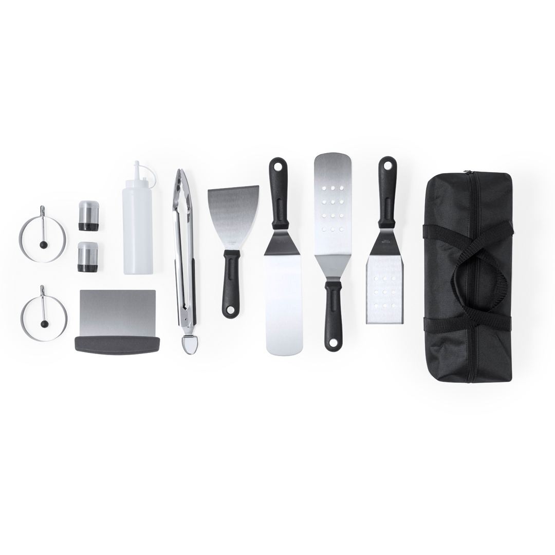 Ensemble de barbecue en acier inoxydable. Comprenant 11 accessoires : 1 spatule lisse, 2 spatules avec trous, 1 grattoir, 1 jeu de pinces, 1 spatule, 1 salière, 1 poivrière, 1 canette doseuse et 2 moules ronds. Tout est présenté de manière organisée, à l’intérieur d’un sac pratique avec fermeture à glissière et poignées pour un transport facile. Présenté dans un sac recyclé individuel.
