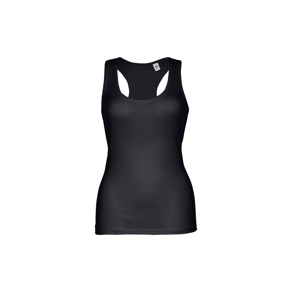 T-shirt sans manches pour femme en maille jersey 100% coton (160 g/m²) avec fil de coton cardé. Avec dos en " T" et col rond. Pièce coupée et cousue avec double surpiqûre en bas et finitions bords aux emmanchures et au col. Tailles: S, M, L, XL, XXL